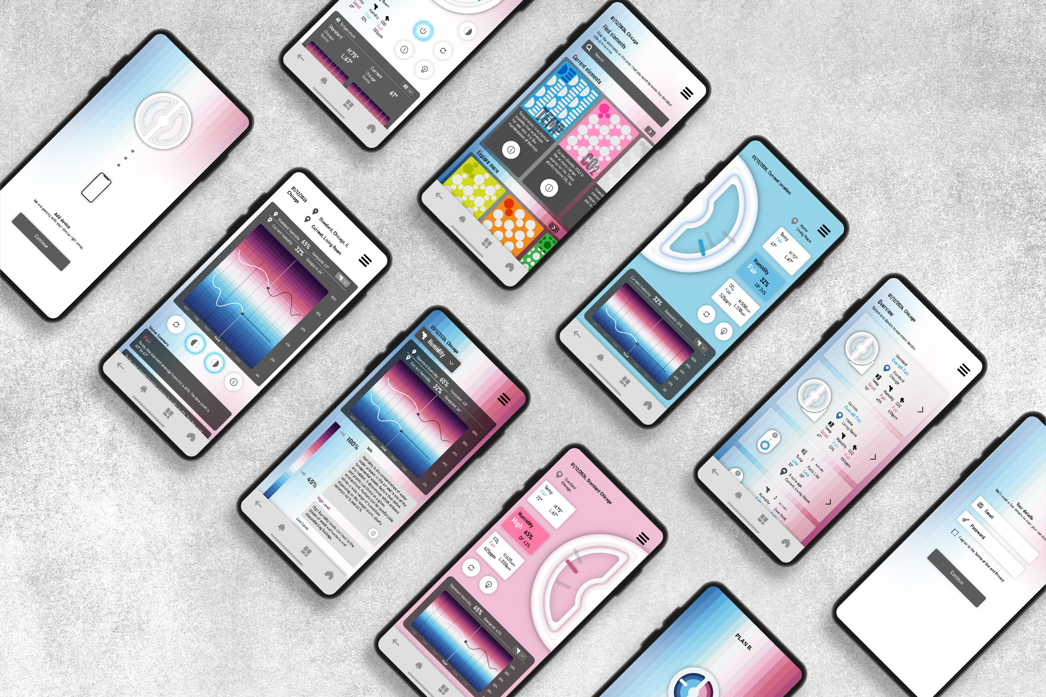The scenario occurs in a future world where sudden climate changes become usual. Plan B. (Plan Balance) is a design system across digital and physical products that can track different environmental elements to help people understand their surroundings. Based on a series of research, the concept of sensing environmental factors is to provide essential information in daily life. Due to the rapidly changing climate, raising awareness of different environmental statuses is more and more critical. Under this condition, intangible elements, such as CO2, O2, humidity, temperature, etc., are critical in humans' living environment. These invisible substances are vital to our bodies, and either an excessive amount is hazardous, or too little is also harmful.