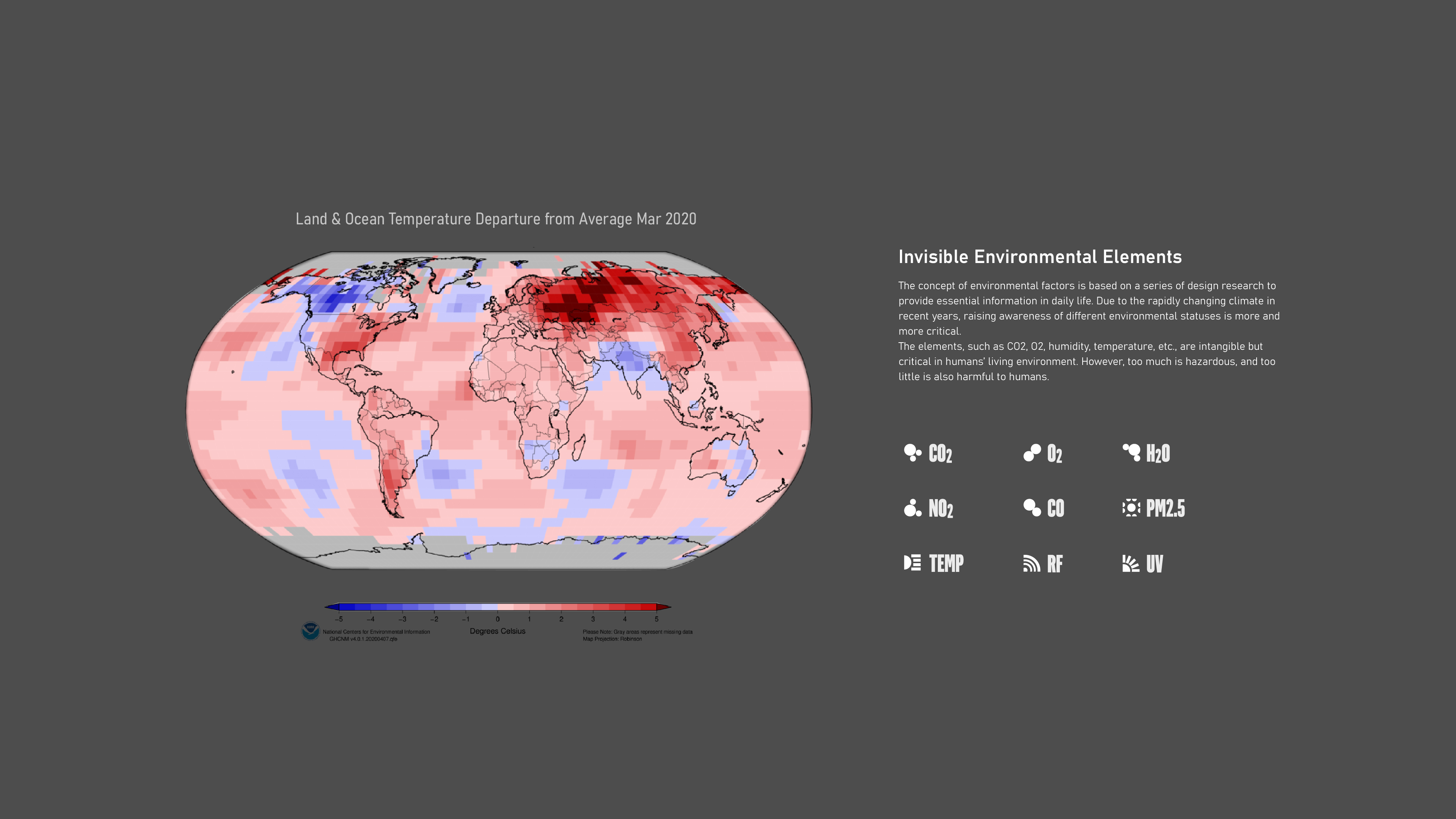 From the balance of nature to understanding people's mindset of the repaid changing climate, we created and imagined a new design experience that helps people to visualize the invisible elements to provide information about their current environment and prevent danger indoors and outdoors.